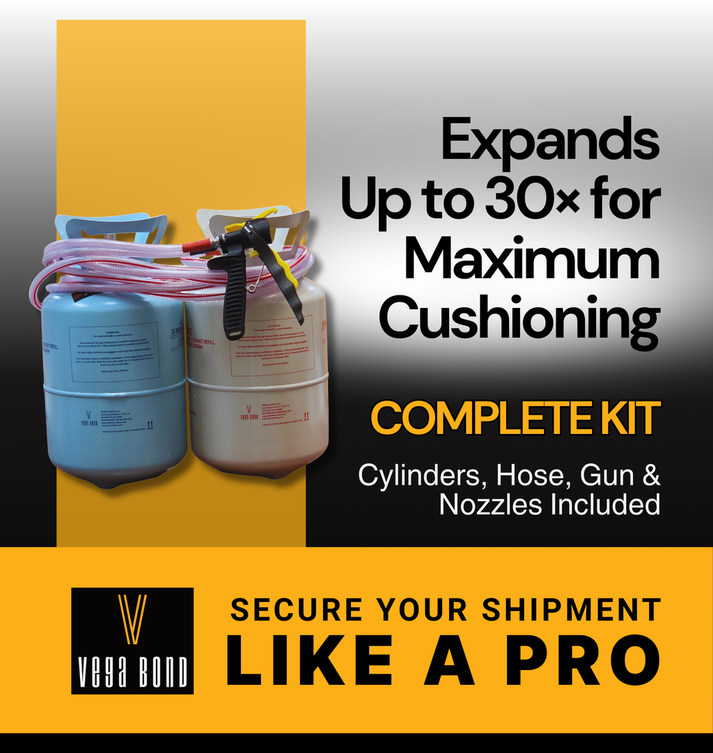 This kit includes two cylinders, a 10-foot hose, gun assembly, and 8 extra nozzles. The foam expands up to 30 times its liquid volume, creating custom-fit protection for each package.
